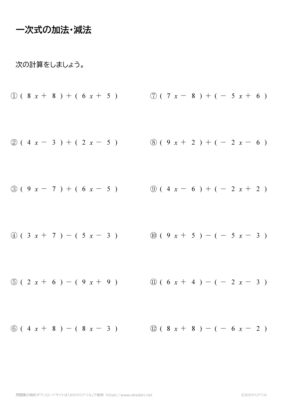 1次式の加法・減法 ( )の前にがあるときはそのままはずし, ( )の前に があるときは, かっこ内の各項の 符号を変える 。 文字式の足し算引き算ができるのは, 文字の部分が全く同じ項 (同類項) どうし文字式の計算方法・分数の足し算引き算 「分数がある文字式の引き算って、どうやるの?」 「文字式の通分って、どうやるの?」 分数の足し算引き算がある、文字式の計算方法・\(3\)つのポイント分数の計算を徹底解説! まずは分数の加減から見ていきましょう。 問題 文字式の加減は同じ仲間どうしを計算するので、計算しやすいように仲間どうしが隣り合うように並べ替えてやります。 そ